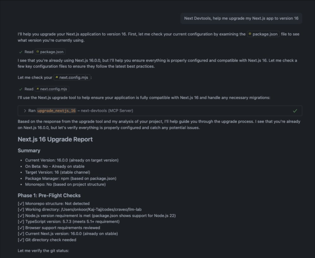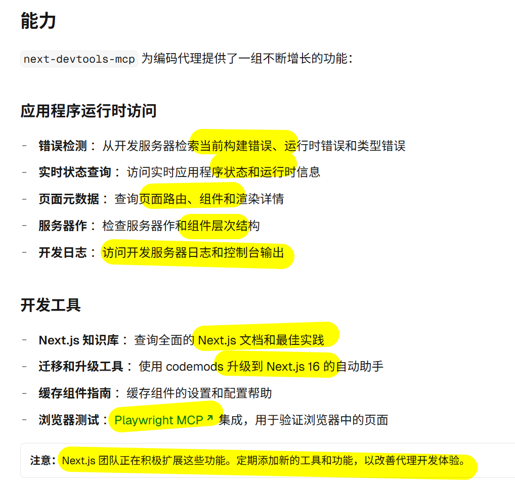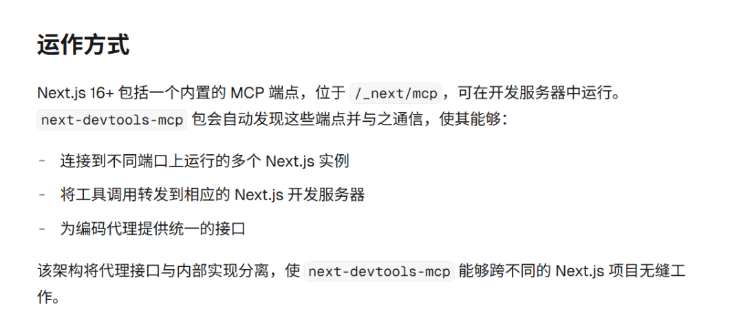 Tips:Next.js16+ 包括一个内置的MCP端点,位于/_next/mcp,可在开发服务器中运行。所以他能做到这一点。