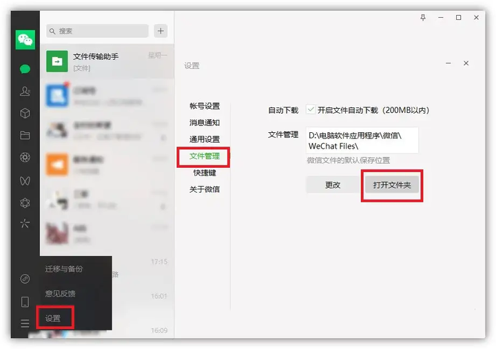 打开微信中的设置。选择【文件管理】->【打开文件夹】