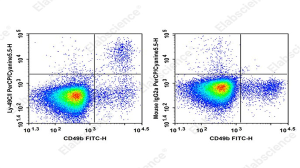 PerCP/Cyanine5.5 标记抗小鼠 Ly-49C/I 抗体[5E6]的克隆号 5E6 特异性识别 Ly-49C 的 CRD 结构域,可阻断 Ly-49C [BALB]、Ly-49C [B6] 与 b、d、k、s 单倍型 MHC I 类抗原的结合,同时能识别 Ly-49I [B6] 与 r 单倍型 MHC I 类抗原的弱相互作用。在流式检测中,抗体与细胞表面 Ly-49C/I 特异性结合后,通过 PerCP/Cyanine5.5 荧光素的信号放大,可在流式细胞仪上精准区分表达 Ly-49C/I 的细胞亚群,实现对目标细胞的定性与定量分析。搭配 FITC 标记的 CD49b 抗体等标志物,可进一步提升细胞亚群分选的准确性。