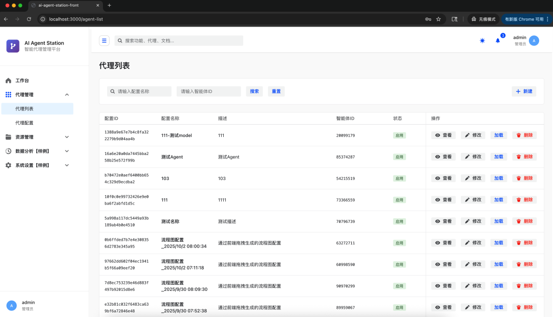 - 这里的代理列表,就是通过拖拉拽配置的智能体。可以点击【查看】看到明细,也可以【新建】,还可以删除。