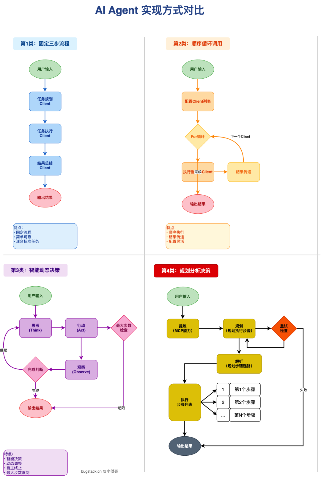 在整个 Ai Agent 的实现中,小傅哥带着大家分析设计了4种方案,包括;固定执行的、循环执行的、智能分析决策的还有一个按照步骤规划的。这些流程都有适合于自己业务场景使用。在代码中也都有不同方案的实现,之后通过用户选择后进行动态化的策略调度。