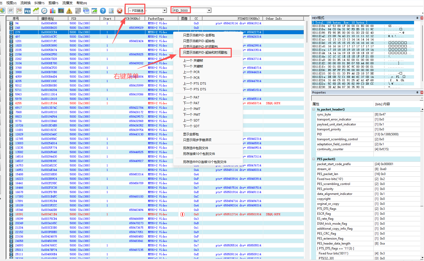 1.TS包列表:序号,偏移地址,PID,起始标识,包类型,时间戳(PCR,PTS,DTS),图像类型(标识I、B、P)等