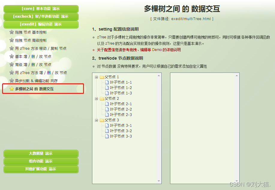 注意说明:该案例需单独引入demo.css,同时div中的class名字好像必须指定官网给定的那个名字,比如class="content_wrap",class="zTreeDemoBackground left",class="zTreeDemoBackground right", 否则外面没有边框背景样式。