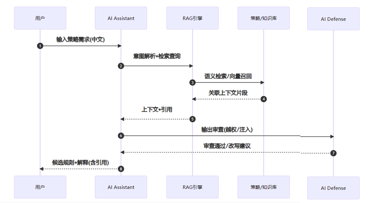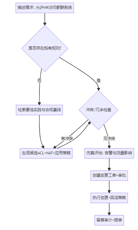 规则新增 | 人工阅读文档+手写ACL | 自然语言生成候选规则+自动校验 | 降低耗时与出错率 |