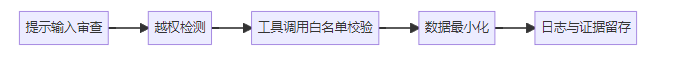 安全 | 提示注入/工具越权 | 白名单与沙箱 |
