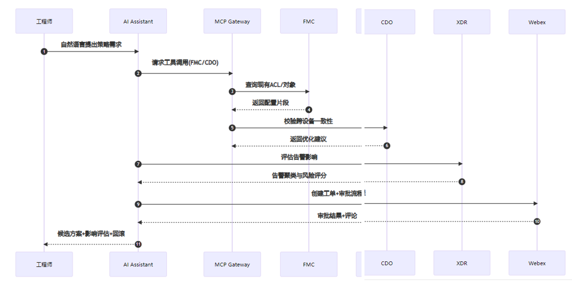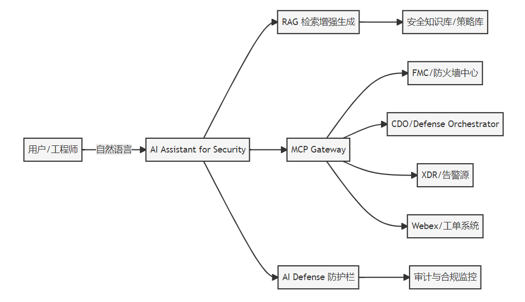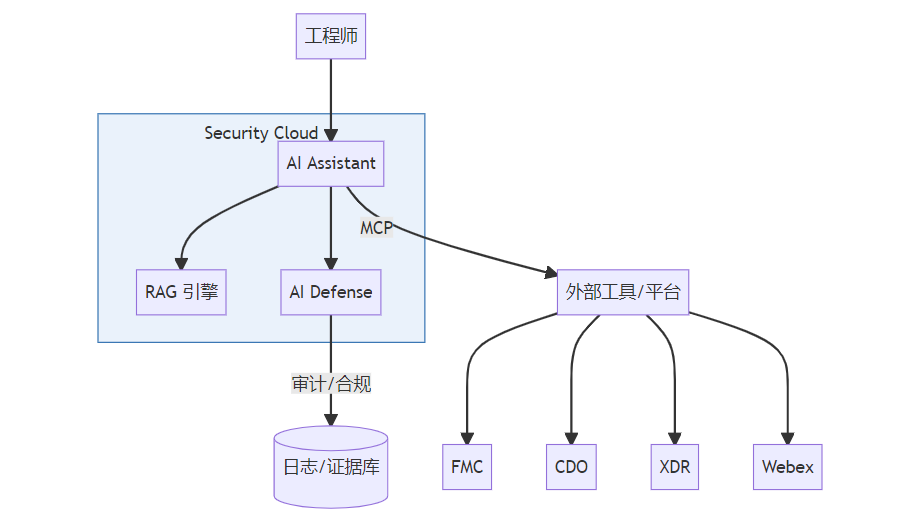Cisco AI Assistant for Security正是为这些痛点而生:它把LLM、RAG与安全域知识结合在一起,通过自然语言生成、审查与优化安全策略,并通过MCP(Model Context Protocol)将外部工具与数据源安全地纳入AI工作流。本文从工程视角出发,拆解其架构、管控与运维策略,用可复现的流程图与表格带你走完整条路径。