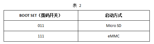 评估板支持通过系统启动卡(即Micro SD启动模式)或eMMC启动系统,可通过评估板上BOOT SET启动方式选择拨码开关进行启动方式选择,具体配置对应关系如下。
