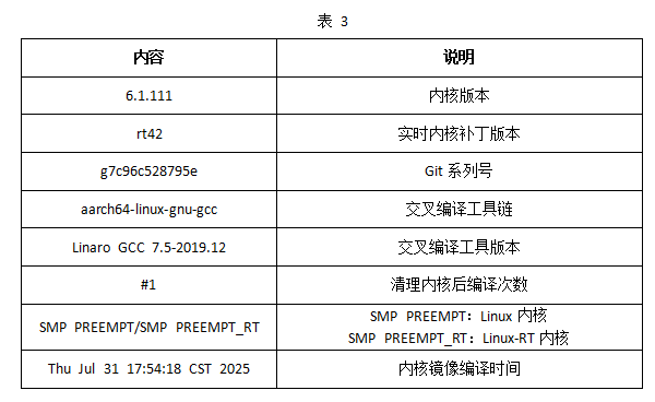 如上打印信息可知,内核版本为6.1.111-rt42-g7c96c528795e。打印信息解析如下表所示: