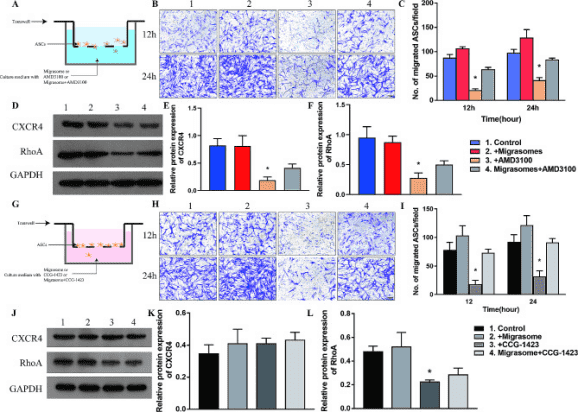 Migrasomes promote migration of ASCs in vitro via activation of CXCR4/RhoA signaling by CXCL12[5].