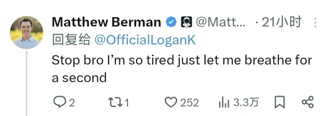 这次发布的产品迭代速度极快,甚至让谷歌内部员工都感到压力。就在发布前几小时,工程师Matthew Berman在社交平台上表示:“别说了,我太累了,让我喘口气。”