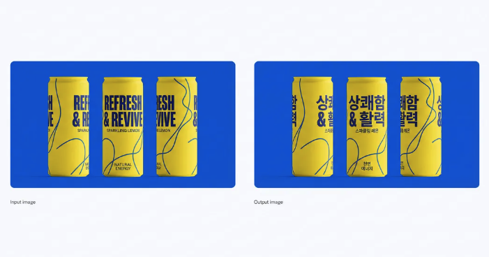 比如将饮料罐上的英文“REFRESH”替换为韩文,模型不仅能准确翻译,还能保留原有的字体风格、排版位置以及金属罐体的反光质感。