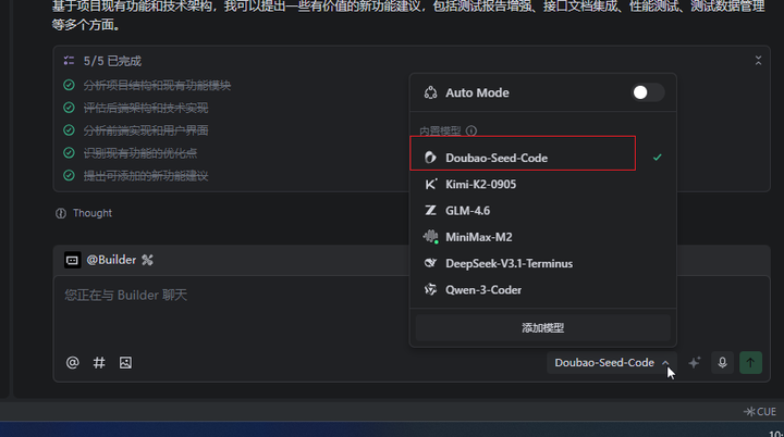 1、性能与稳定性实测 经过多轮对话下来,响应速度从感官上来看我觉得还可以,然后整个过程中也还比较稳定,暂时没遇到过像其他工具那样问着问着失败要重试的情况。并且多轮对话中,长上下文的记忆能力不错,没发生"失忆"的情况。 2、优势与边界:来自真实项目的思考 ### 真正惊艳的能力 1. **"代码考古"能力**:面对一个完全陌生的项目,它能从文件命名、import语句、类方法名中准确推断业务意图,我觉得这一点就很不错。比如看到`execute_testcase_with_log_stream`方法名,立即理解这是支持实时日志推送的测试执行接口。当然,这也需要之前写代码的人对编码有一定的规范,要是函数和变量啥的都随便定义什么a、b、c之类的,那就再牛逼的大模型都会有点捉襟见肘。 2. **工程化任务管理**:使用TODO列表维护分析进度,主动标记任务状态(进行中/已完成),这比一次性输出更符合复杂项目分析节奏。它理解"系统性分析"需要分步骤,而不是一股脑随便写。