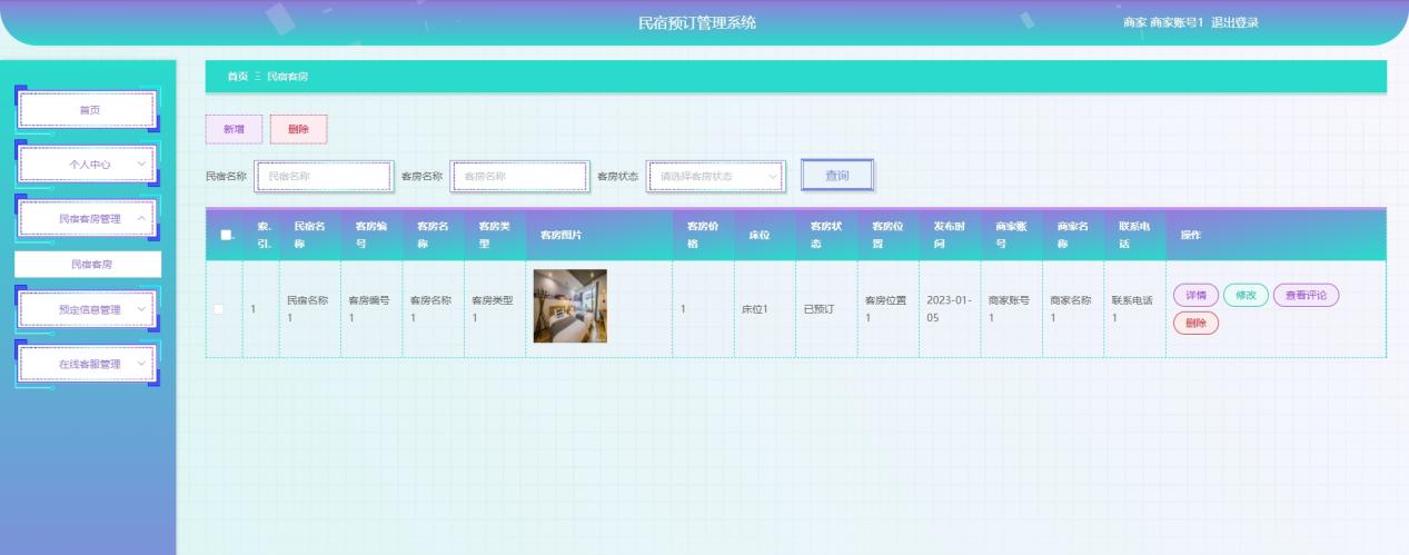 商家通过后台服务端进行登录后,可以发布民宿客房信息,包括房间类型、价格、图片和民宿位置等。商家还可以查看用户的预定情况,包括预定状态、支付状态等,以便进行后续的接待和服务。此外,商家还可以管理自己的账户信息,如修改密码等。