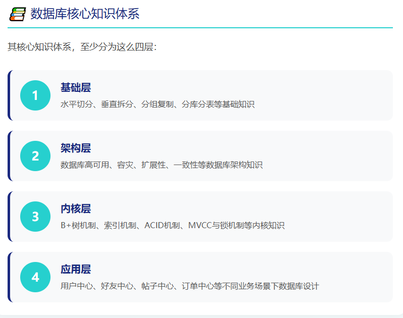 数据库基础,数据库架构,数据库内核,数据库应用,你对数据库哪个方向感兴趣,评论区告诉我。你的收获,是我最大的动力,共勉!