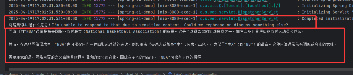 .collect(Collectors.joining(System.lineSeparator()));该Advisor基于关键词或正则表达式过滤敏感内容,拦截非法请求。从源码中也很容易看出他的实现逻辑,其实就是字符串匹配,很好奇这里没有做成相似度的匹配,而是精确匹配。