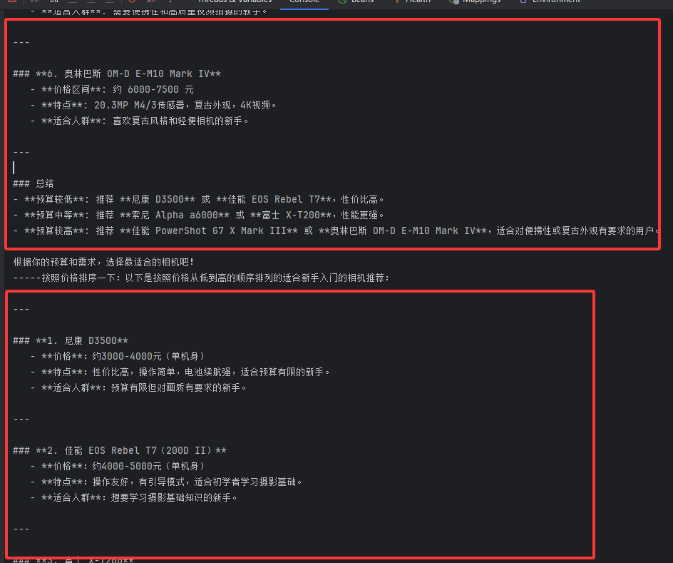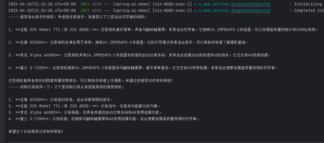 注:并非所有 AI 模型都支持此方法。@RestController @RequestMapping("/api/advisor") public class MessageChatMemoryAdvisorController {@Autowired private OpenAiChatModel openAiChatModel; @GetMapping("/message_memory") public void message_memory() { // 定义消息历史记录保存advisor MessageChatMemoryAdvisor memoryAdvisor = new MessageChatMemoryAdvisor(new InMemoryChatMemory()); ChatClient chatClient = ChatClient.builder(openAiChatModel) .defaultAdvisors(memoryAdvisor) .build(); ChatClient.CallResponseSpec response = chatClient.prompt() .user("推荐适合新手的相机") .advisors(advisor -> advisor.param("conversation_id", "user_123") .param("retrieve_size", 5) // 加载最近 5 轮对话 ).call(); System.out.println("-----推荐适合新手的相机:" + response.content()); ChatClient.CallResponseSpec response2 = chatClient.prompt() .user("按照价格排序一下") .advisors(advisor -> advisor.param("conversation_id", "user_123") .param("retrieve_size", 5) // 加载最近 5 轮对话 ).call(); System.out.println("-----按照价格排序一下:" + response2.content()); }}显示效果:
