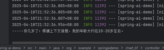 advisedSystemParams.put("memory", memory);我们将上面示例代码的MessageChatMemoryAdvisor替换成PromptChatMemoryAdvisor,同样能实现类似的效果。但是经过测试发现,PromptChatMemoryAdvisor响应速度更快。