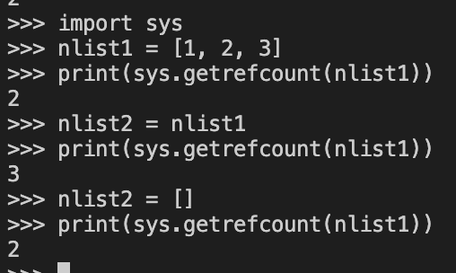 取消引用 clist2 = clist1 print(sys.getrefcount(clist1)) clist2 = [] print(sys.getrefcount(clist1)) del clist1 print(sys.getrefcount(clist1))