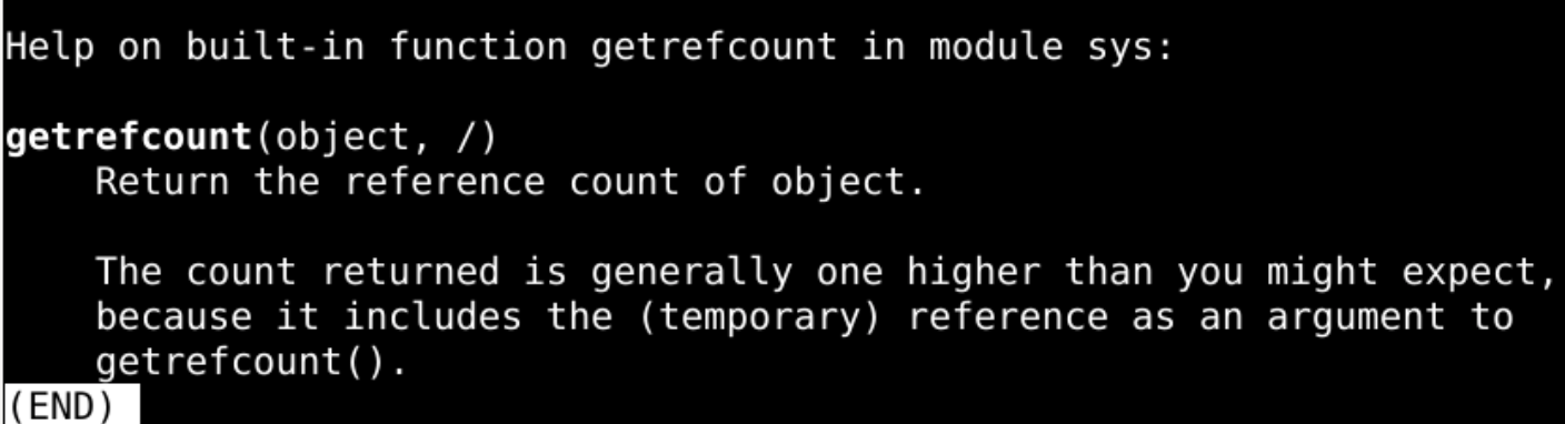 2个引用 呢?帮助手册 import sys help(sys.getrefcount)