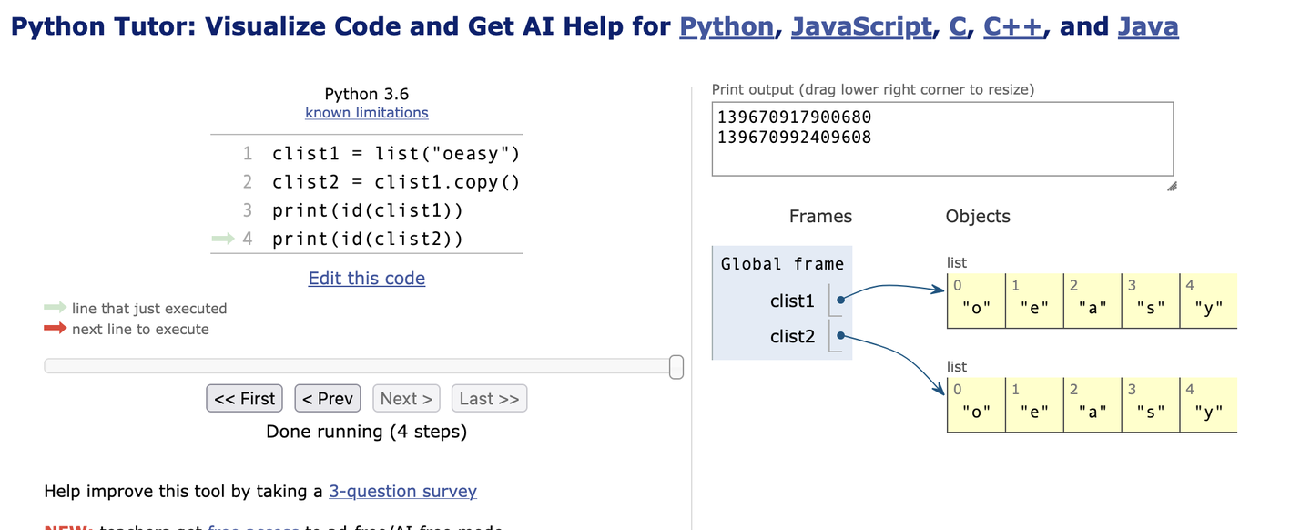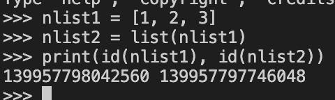 clist1 = list("oeasy") clist2 = clist1.copy() print(id(clist1)) print(id(clist2))