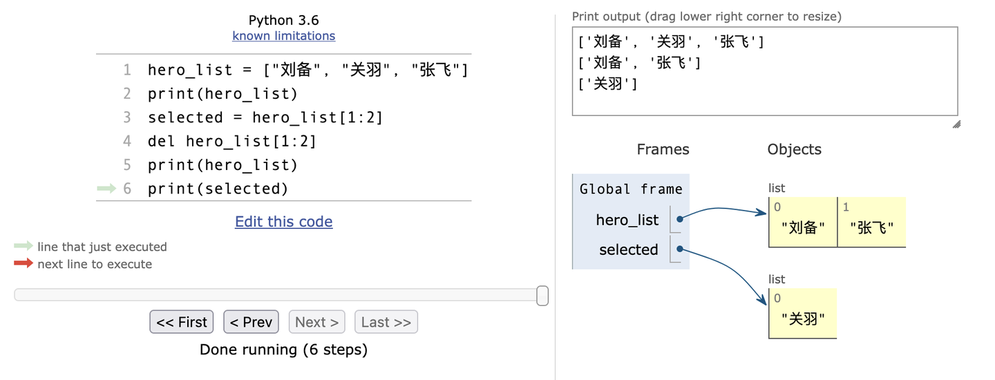 新变量 呢?hero_list = ["刘备", "关羽", "张飞"] print(hero_list) selected = hero_list[1:2] del hero_list[1:2] print(hero_list) print(selected)