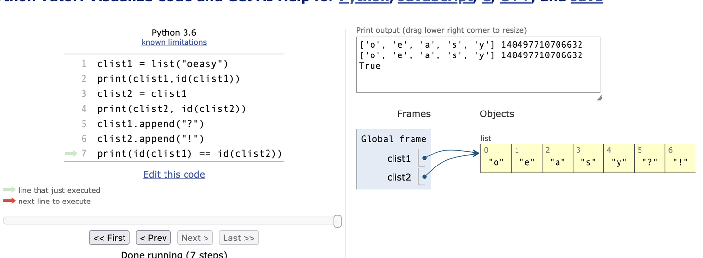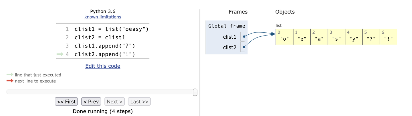 clist1 = list("oeasy") print(clist1,id(clist1)) clist2 = clist1 print(clist2, id(clist2)) clist1.append("?") clist2.append("!") print(id(clist1) == id(clist2))