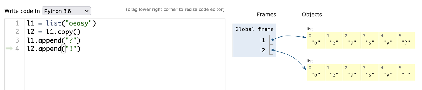 clist1 = list("oeasy") clist2 = clist1.copy() clist1.append("?") clist2.append("!")