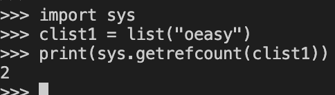 引用次数import sys clist1 = list("oeasy") print(sys.getrefcount(clist1))