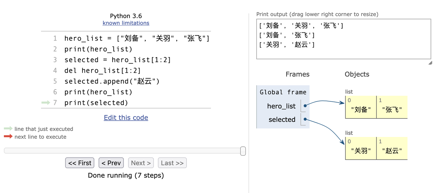 hero_list = ["刘备", "关羽", "张飞"] print(hero_list) selected = hero_list[1:2] del hero_list[1:2] selected.append("赵云") print(hero_list) print(selected)