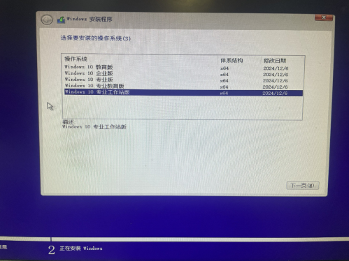 5.版本选择:Windows 10专业工作站版 然后选择优盘中的系统镜像,因为这是全镜像,所以包含多版本镜像,选择了镜像后,会弹出ISO镜像列表,这次安装选择Windows10 Pro Workstation(win10工作站版)。