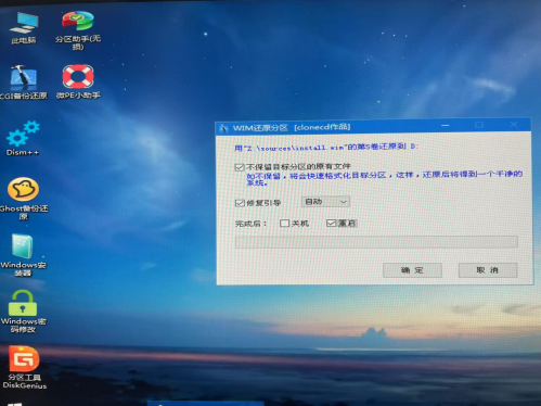 6.确认还原并重启 点击确定。提示还原后是重启还是关机,等待系统安装然后重启即可安装完系统。
