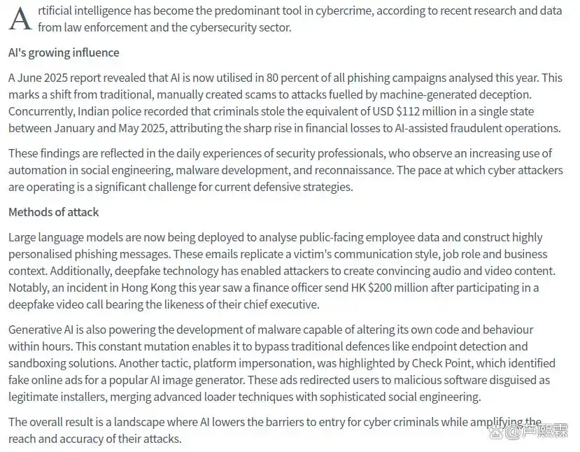 近年来,人工智能(Artificial Intelligence, AI)技术在自然语言处理、图像生成和行为建模等领域取得显著进展,其应用已深度渗透至金融、医疗、政务及企业运营等多个关键场景。然而,技术的双刃剑属性亦随之凸显:AI不仅赋能合法业务,亦被恶意行为者系统性地用于网络攻击。据2025年6月发布的安全报告显示,全球范围内约80%的钓鱼攻击已采用AI生成内容,其中印度一国在2025年前五个月因AI驱动的欺诈活动损失高达1.12亿美元。这一数据揭示出AI正从辅助工具演变为网络犯罪的核心基础设施。