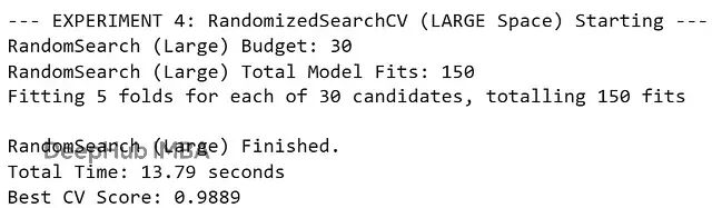 print("--- EXPERIMENT 4: RandomizedSearchCV (LARGE Space) Starting ---")