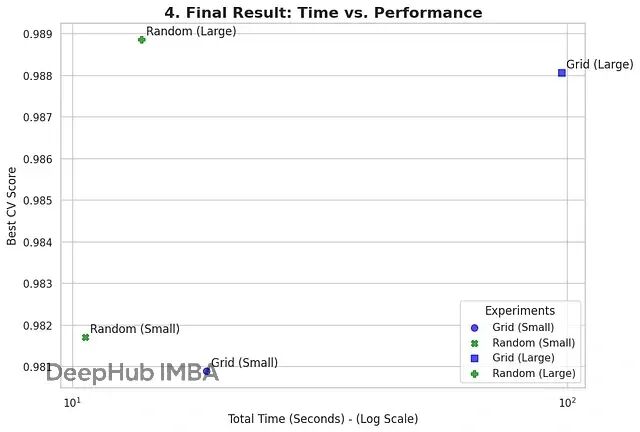 现在把小参数空间和大参数空间的实验结果放一起看:最佳CV分数(模型性能)和总耗时(计算效率)。
