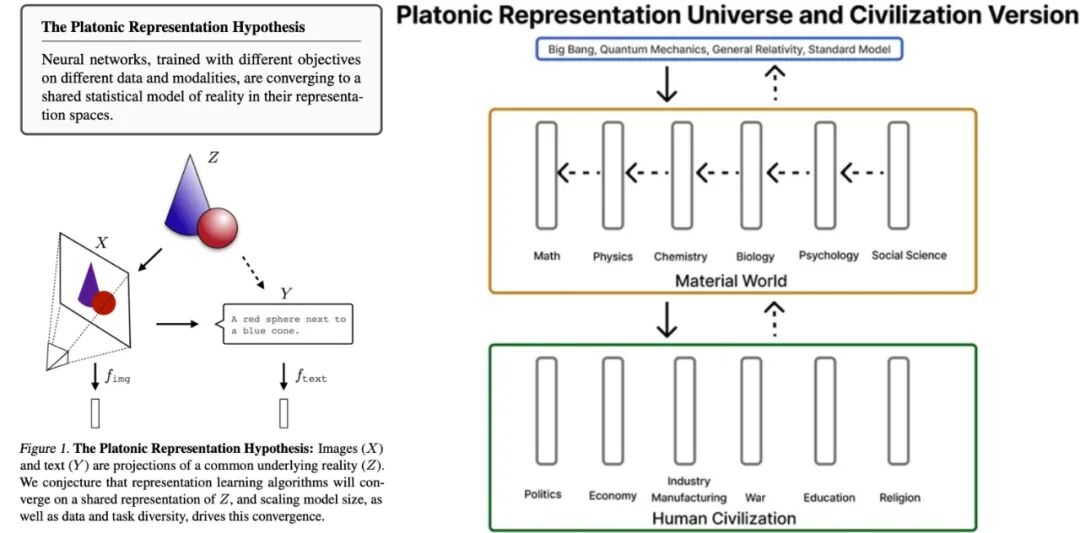 Minyoung Huh 等作者提出柏拉图表征 Platonic Representation Hypothesis, 他们统计了数百个在不同深度网络架构和模态(图像和文本)上训练的 AI 模型,发现这些模型倾向于在其表征空间中收敛到一个相近的统计结果,这种统计结果是对现实的映射。他们假设这种收敛会到达一个理想化现实的表征,称为柏拉图表征(Platonic representation),这一术语参考了柏拉图在《理想国》中的洞穴寓言。