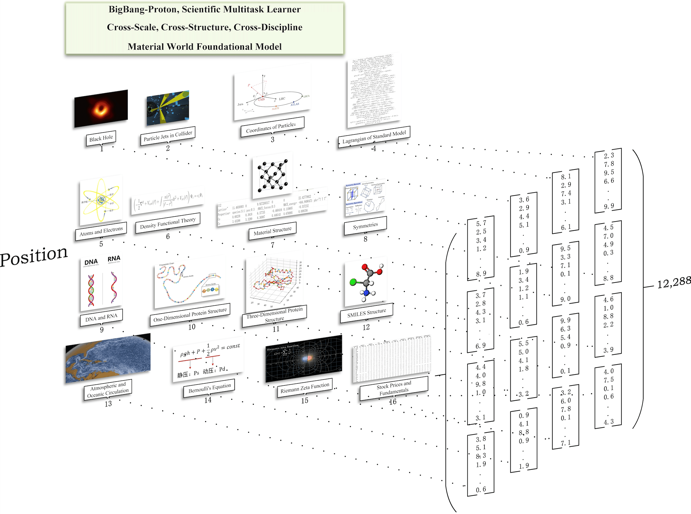 首先,建立一个统一的时空框架,跨越宇宙、星系、地球到夸克尺度,将每个自由度置于一个一致的时空结构中。其次,整合人类科学探究在所有尺度、结构和学科上产生的所有理论和实验数据,这相当于整个可观测宇宙历史的总数据内容。最后,通过整合所有天然材料和人造物体及活动(包括建筑、城市、工厂、车辆、飞机以及经济、政治、战争等)的数据,从重子组分中重建地球和人类文明。BigBang-Proton 的创新为宇宙尺度数据的预训练提供了不可或缺的方法论。