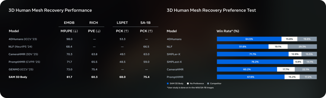 为了训练模型,Meta 还构建了一个包含约 800 万张图像的高质量训练数据集,使其能够应对遮挡、罕见姿态和各种服装,并在多个 3D 基准测试中均超越了以往的模型。