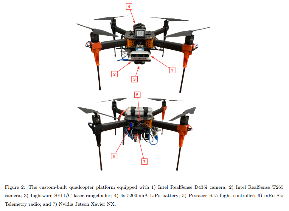 研究使用定制四旋翼平台,轴距为450 mm,搭载Intel RealSense D435i摄像头(70°视场角)用于RGB图像采集,RealSense T265摄像头提供视觉里程计,SF11/C激光测距仪用于高度测量。飞行控制器采用PixRacer R15,运行PX4飞控栈,机载计算单元为Nvidia Jetson Xavier NX,外接固态硬盘存储数据。系统由4S锂聚合物电池供电,续航时间约13分钟,起飞重量1.8 kg。