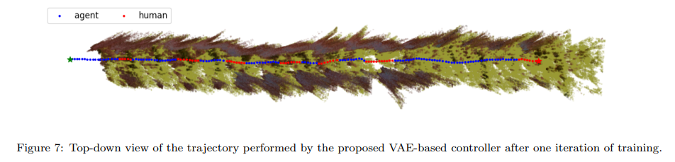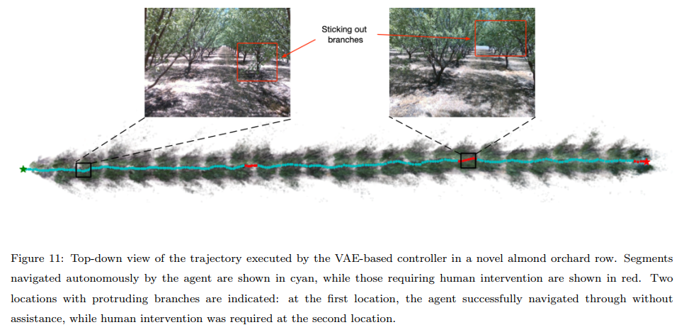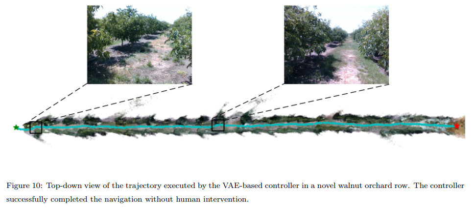 通过SLAM库重建3D点云地图,可视化无人机轨迹。训练一轮后,代理策略已具备基本导航能力,但仍需人工干预;训练三轮后,代理可实现完全自主飞行,成功避障。在未训练的新行中,VAE控制器仍能实现自主导航,表现出良好的泛化能力。进一步在杏仁园和核桃园中的实验表明,控制器在复杂环境中仍能有效导航,仅在极端情况下需人工干预。