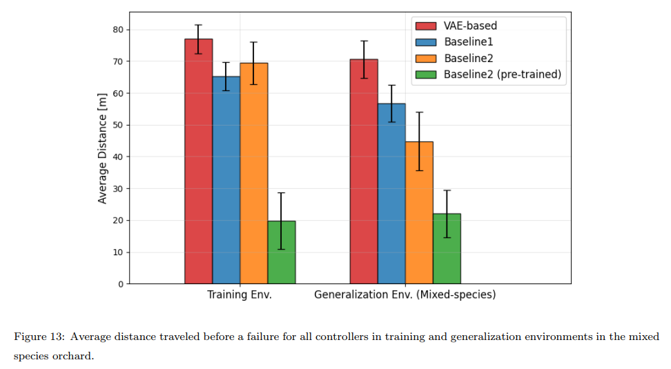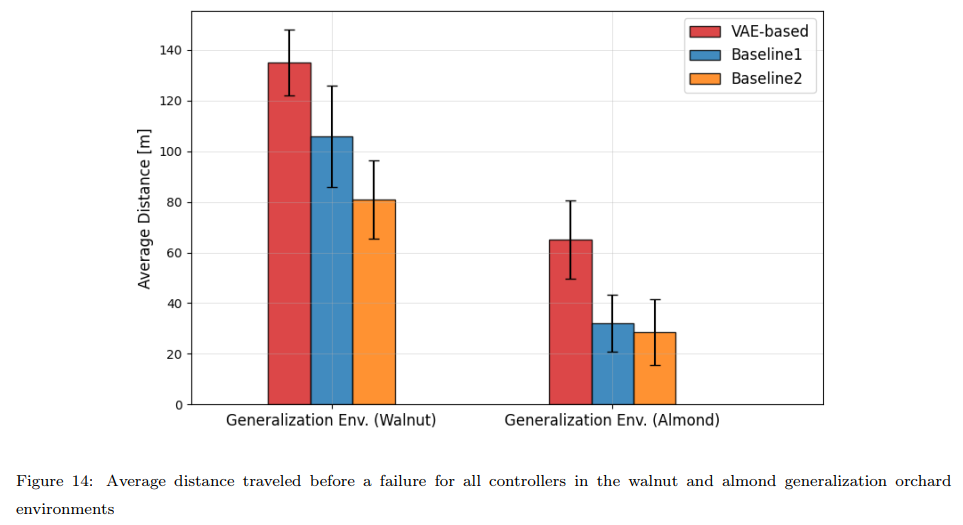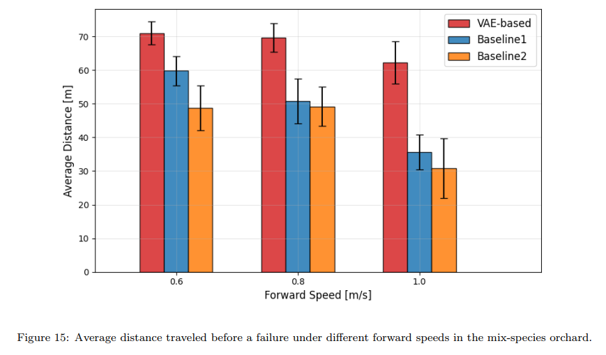 处理时间方面,VAE控制器和baseline2均能在机载计算机上实时运行,而baseline1因需显式特征提取,处理时间较长。VAE控制器在泛化至新果园和不同速度时均表现出强鲁棒性。