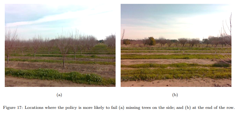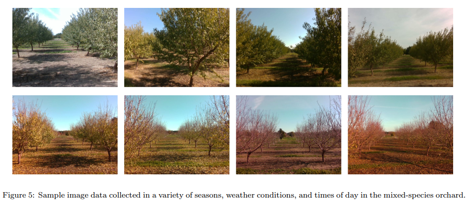数据收集在美国加利福尼亚州戴维斯附近的混合树种果园中进行,包括杏仁、核桃、李子、开心果和桃树,行距6.10 m,株距4.57 m,行长约73.15 m。图像数据在多个季节(夏、秋、冬)、天气(晴、阴)和时段(早、中、晚)采集,共110,551张图像(640×480像素)。数据增强包括亮度、对比度、饱和度、锐度调整和随机水平翻转。