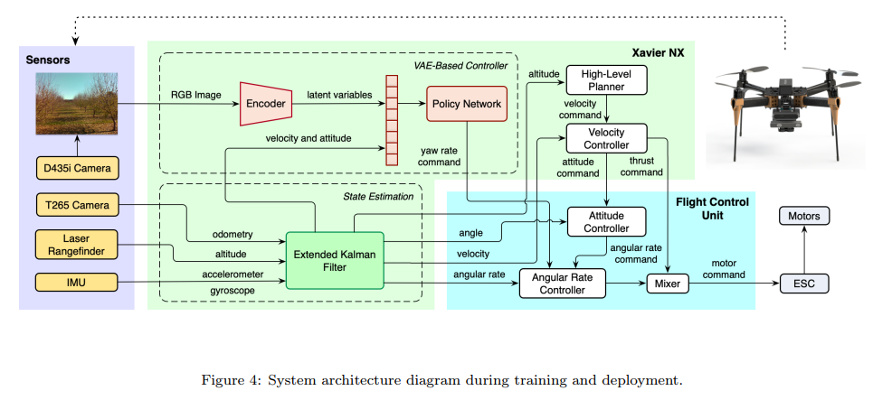 系统架构包括图像采集、状态估计、控制命令生成和电机控制等部分。D435i摄像头以30 Hz频率输出RGB图像,T265摄像头提供视觉里程计,激光测距仪提供高度数据,与IMU数据通过EKF融合,估计无人机状态。高层规划器根据高度生成速度命令,通过PID速度控制器和姿态控制器实现速度跟踪和姿态控制。VAE控制器以30 Hz频率生成偏航速率命令,直接输入角速率控制器。电机控制由PX4飞控栈管理,通过ROS与机载计算机通信。