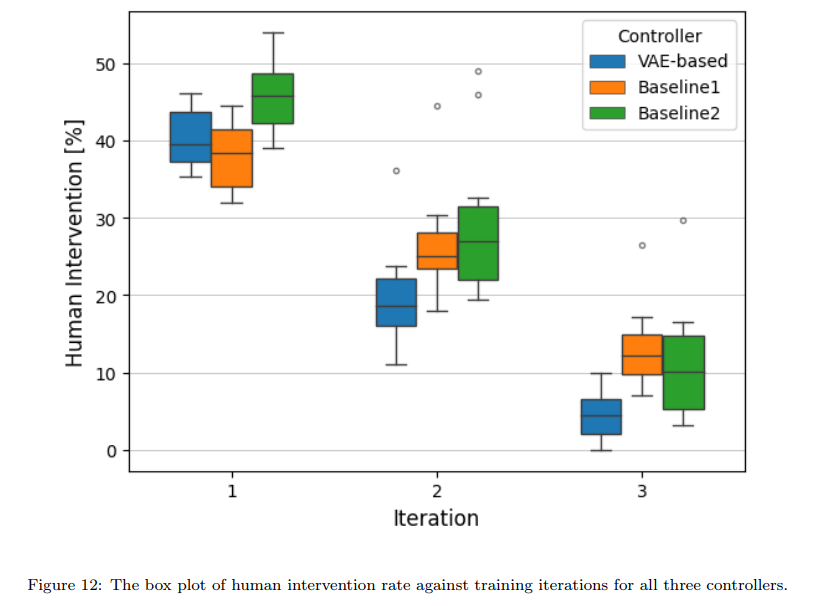 与两种基线算法(基于线性回归的baseline1和基于CNN的baseline2)相比,VAE控制器在人工干预率、飞行距离和速度适应性方面均表现更优。经过三轮训练,VAE控制器的平均干预率降至10%以下,显著低于基线方法。t检验结果表明,VAE控制器在统计意义上优于基线方法。在训练和泛化环境中,VAE控制器的平均飞行距离更长,且在速度提升至0.8 m/s和1.0 m/s时仍保持良好性能。