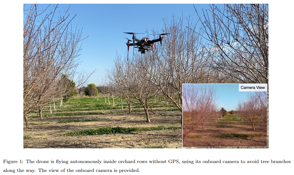 近年来,无人机技术在农业应用中取得了显著进展,尤其是在果园行内导航方面,可用于作物检测和产量估计等任务,为遥感和精准农业提供了有力工具。然而,现有无人机多依赖GPS导航,在果园等密闭环境中,茂密的树冠会遮挡GPS信号,限制了其应用。此外,果园中存在未知障碍物(如树枝),常需人工干预进行避障,增加了操作负担。因此,在GPS信号弱、存在障碍物的果园环境中实现自主安全导航,仍是一个具有挑战性的问题。