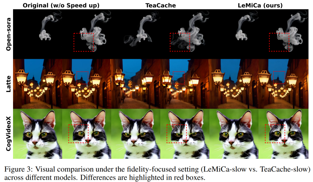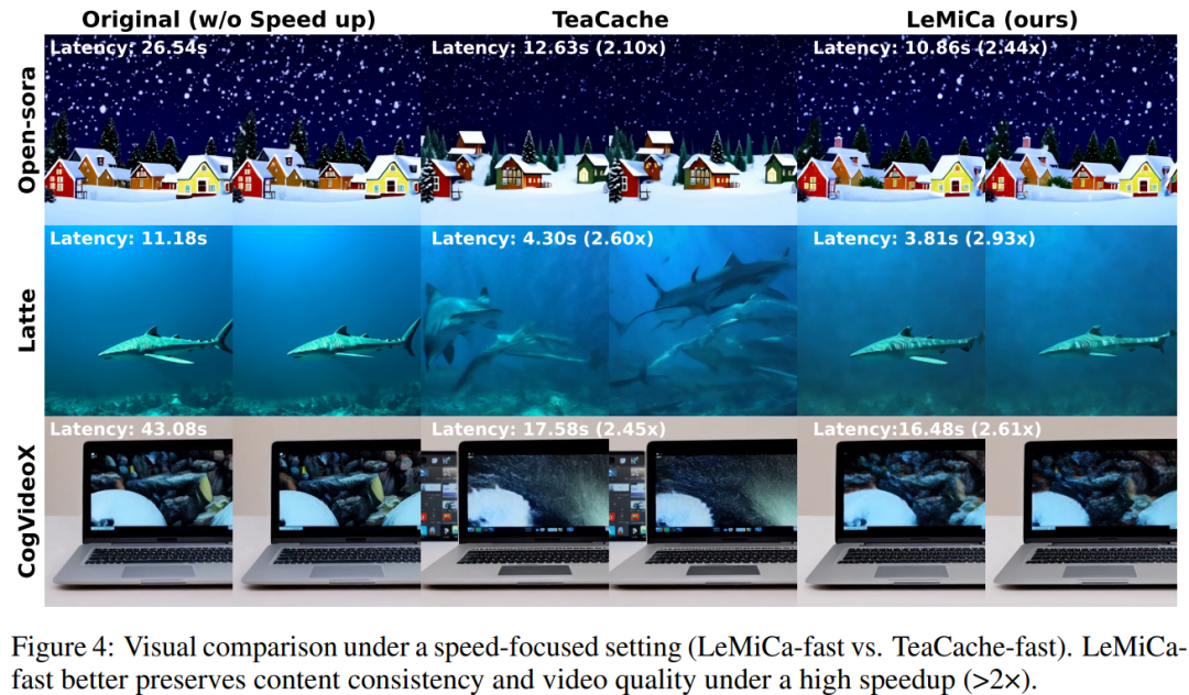 从视觉效果上看,LeMiCa生成的视频在结构风格保持、内容一致性方面都显著提升。