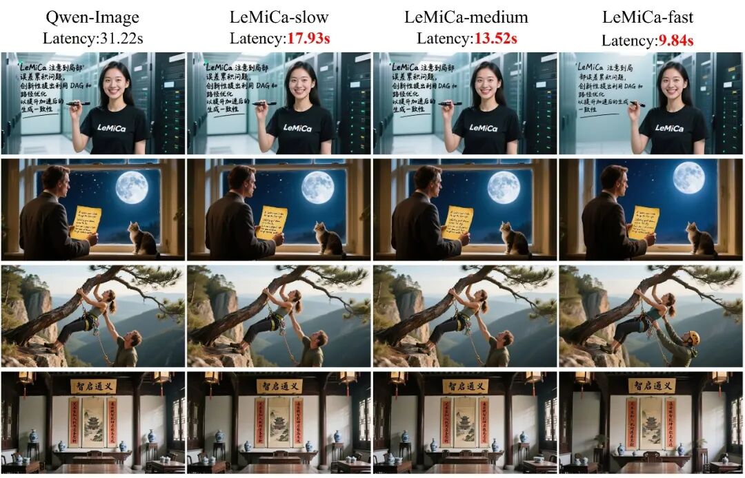文生图模型兼容:由于LeMiCa本质上是一个用于扩散模型缓存加速的框架,因此其也适用于文生图模型。我们拿最新的QWen-Image模型进行了实验,得到了同样出色的加速效果: