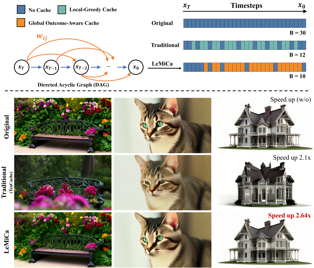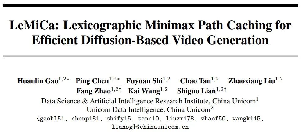 来自中国联通数据科学与人工智能研究院的研究团队提出了一个全新的思路 :LeMiCa(Lexicographic Minimax Path Caching)——一种无需训练、全局最优建模的缓存加速框架,能在保持画质与一致性的同时,实现高效的推理加速。LeMiCa解决的是一个长期被“局部贪心决策”束缚的老问题:扩散模型是否存在一种真正“全局一致、误差可控、速度极快”的缓存加速路径?研究答案是:有。并且比想象中简单得多。