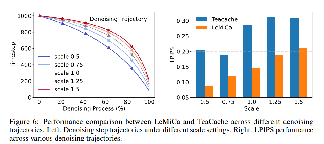 加速路径的鲁棒性:即使改变采样调度中的轨迹缩放参数得到不同的去噪轨迹,LeMiCa仍有较好的效果,体现了良好的路径鲁棒性。
