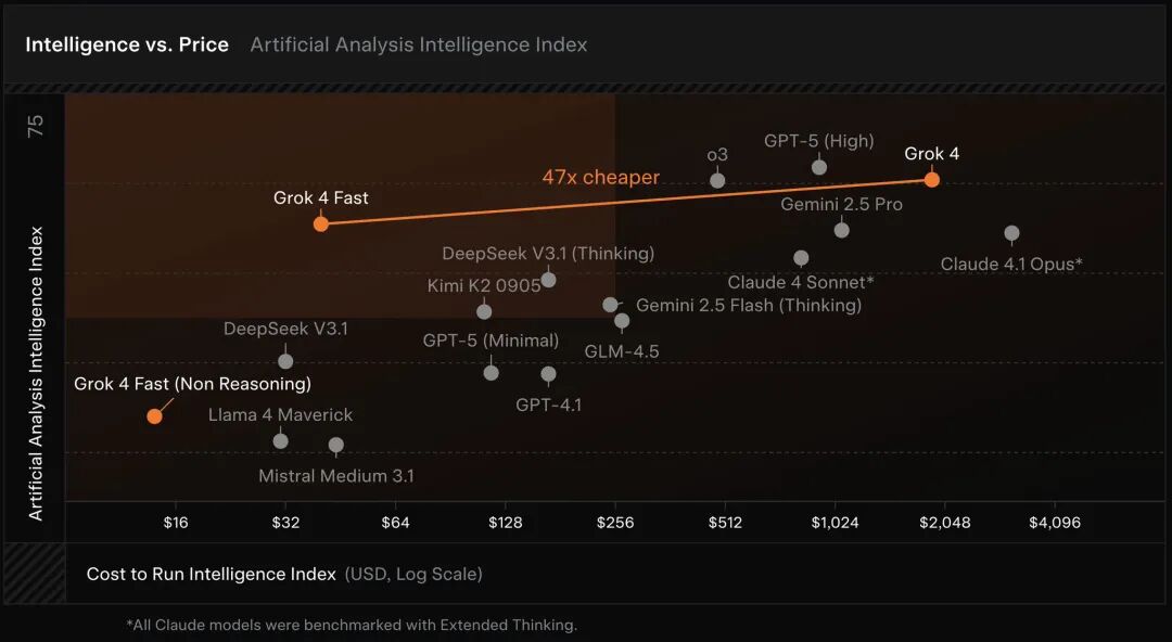 在一个野生的Artificial Analysis Intelligence榜单上在获得高性能同时比他家Grok 4便宜47倍!不过这个你看看就行了,这个榜单吹的Grok4 比claude 4.1, gemini 2.5 pro都要强,实际咋回事大家都知道…