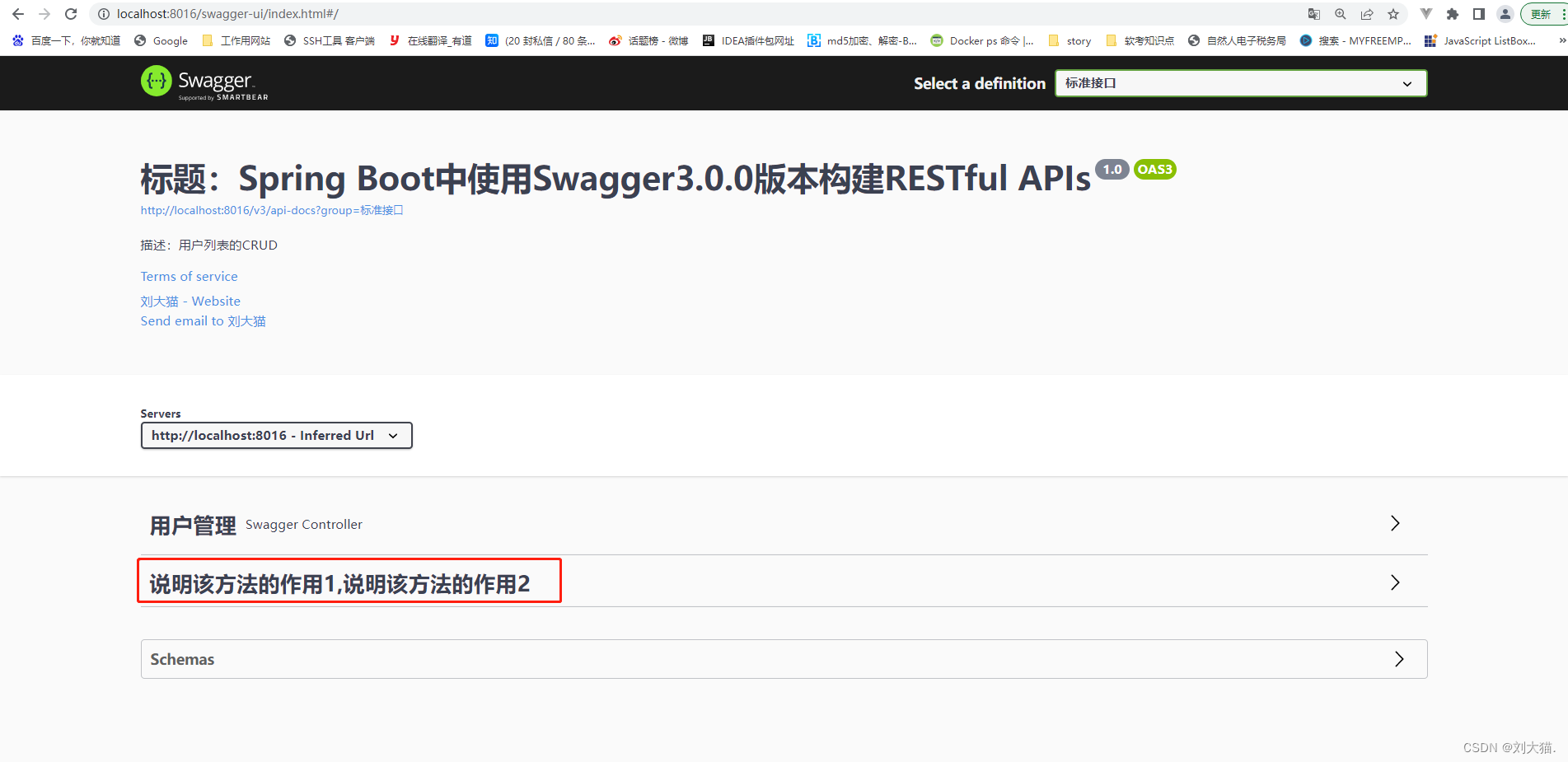 @ApiOperation注解的tags属性尽量少用,因为tags属性会对接口重新分类,导致登录swagger-ui查看接口不清晰,具体如图,比如我只有一个Controller里面包含4个方法,按常理应该只有一个”用户管理“的接口说明,如果我使用tags属性,那么下方会多出一个tags属性标识过的重复的的接口说明(说白了就是有重复的显示,感觉不直观)。